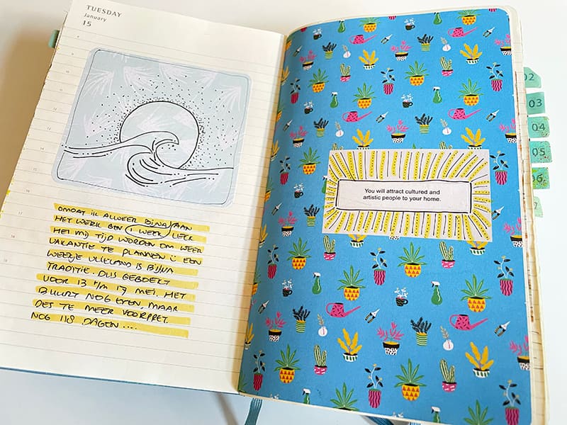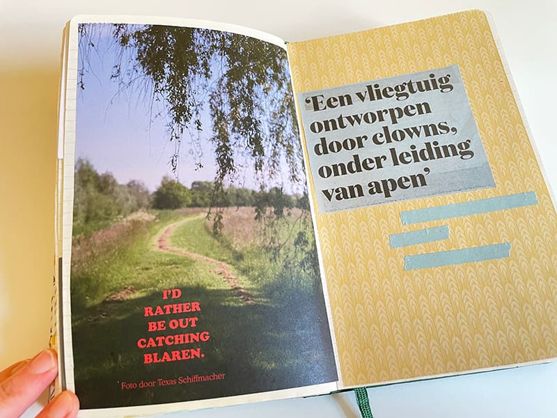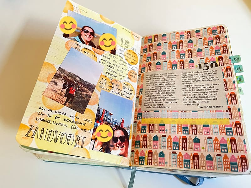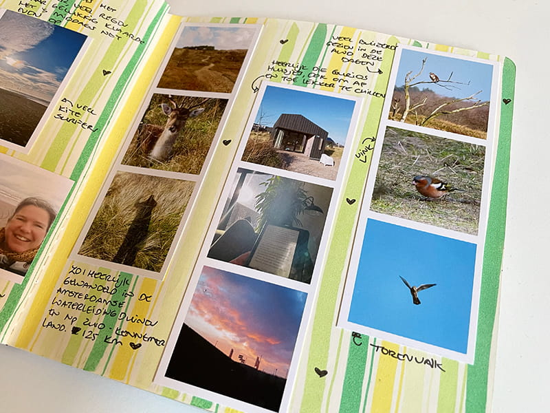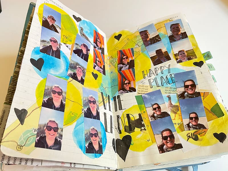 Misschien is het toch nog een beetje de scrapbooker in me die foto’s wil bewaren, maar ik plak dus ook regelmatig fotootjes in. Ik heb kort een fotoprintertje gehad dat kleine fotostickers printte, maar ik was nooit echt tevreden over de kwaliteit. Dus tegenwoordig spaar ik vaak wat foto’s op en laat die dan afdrukken op fotostrips of fotostickers, bijvoorbeeld bij HEMA of Pixum. Inmiddels weet ik het formaat van deze foto’s, dus op mijn art journal pagina laat ik dan plek vrij om die foto’s later aan toe te voegen. Het gaat dan meestal om vakantiefoto’s, selfies of mooie natuurfoto’s die anders toch alleen maar op mijn fotorol op mijn telefoon blijven staan.
