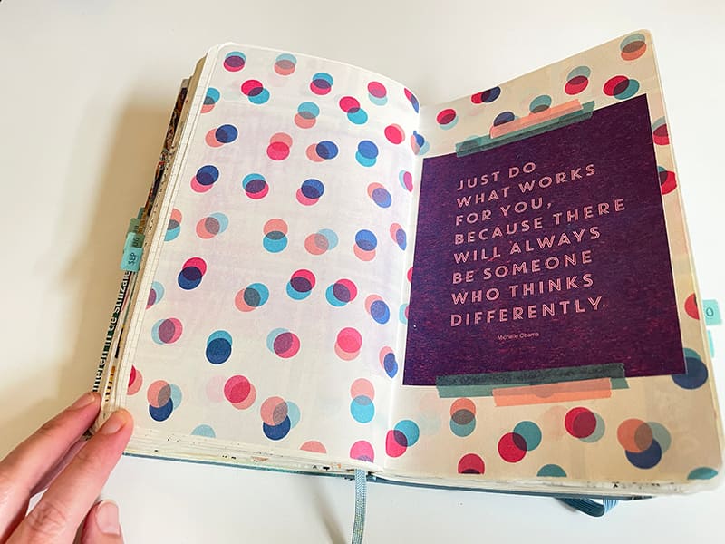 Ik hou ook altijd erg van quotes of mooie teksten vastleggen. Dat kan een flard van een songtekst zijn die me aanspreekt. Maar ook bijvoorbeeld een tekstje die in een fortune cookie zat. Of een opvallende krantenkop. Soms zelfs een hele column die ik leuk vind om te bewaren. Vaak gebruik ik dan een mooi papiertje als achtergrond, misschien wat washi tape. En voila, weer een gezellige pagina.