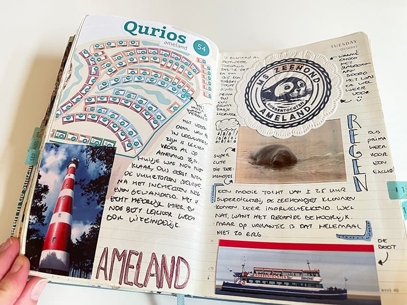 Hierboven (links) heb ik bijvoorbeeld het plattegrondje ingeplakt van het vakantiepark waar ik op Ameland verbleef. En op de boottocht om zeehondjes te spotten dronk ik een warme chocomel, dat stond op een papieren onderzettertje. Daar stond zowel een zeehondje als de naam van de boot op. Als ik de pagina nu weer zie moet ik gelijk weer denken aan dat fijne weekje daar.